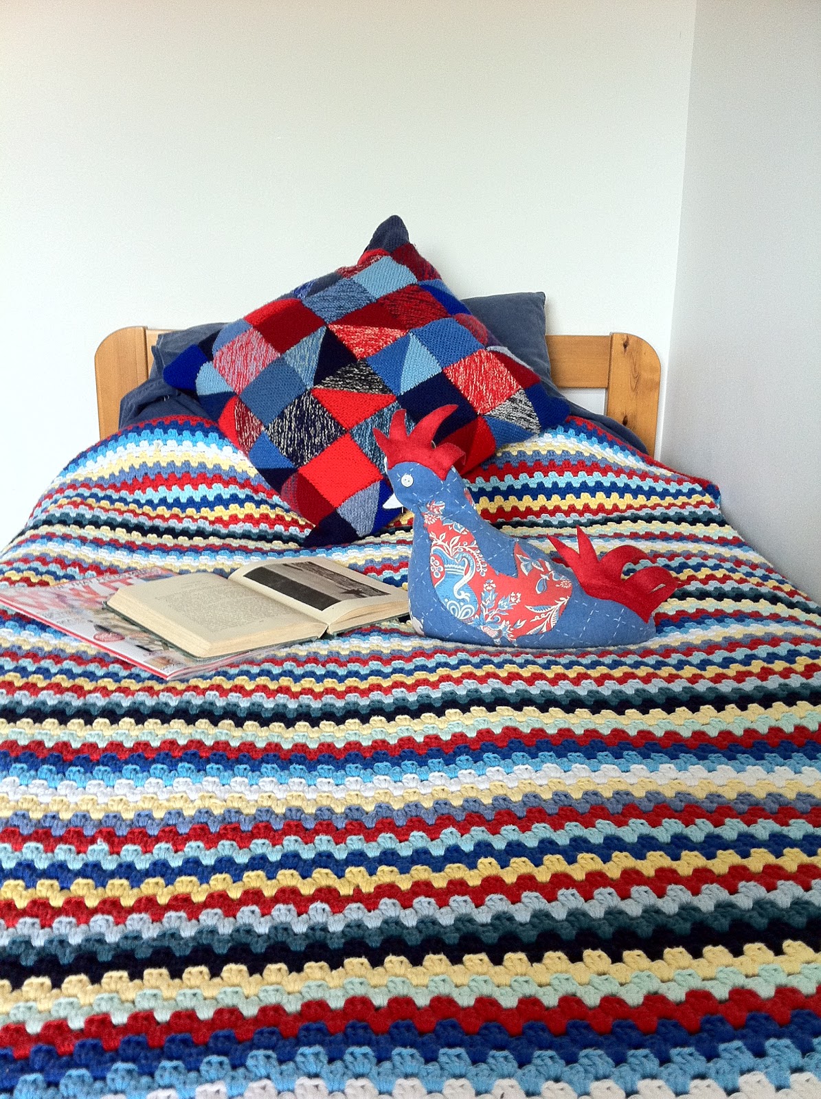 I used Lucy of Attic 24's Granny Stripe Pattern which you can find here. The pattern is very clear and easy to follow. Lucy used a whole rainbow of colours in hers and if I were to make another this is what I would do rather than keep to a more restricted palette like this one. But although perhaps less fun to do, keeping to this palette has had the effect I wanted - bold, bright and definitely-not-too-feminine.